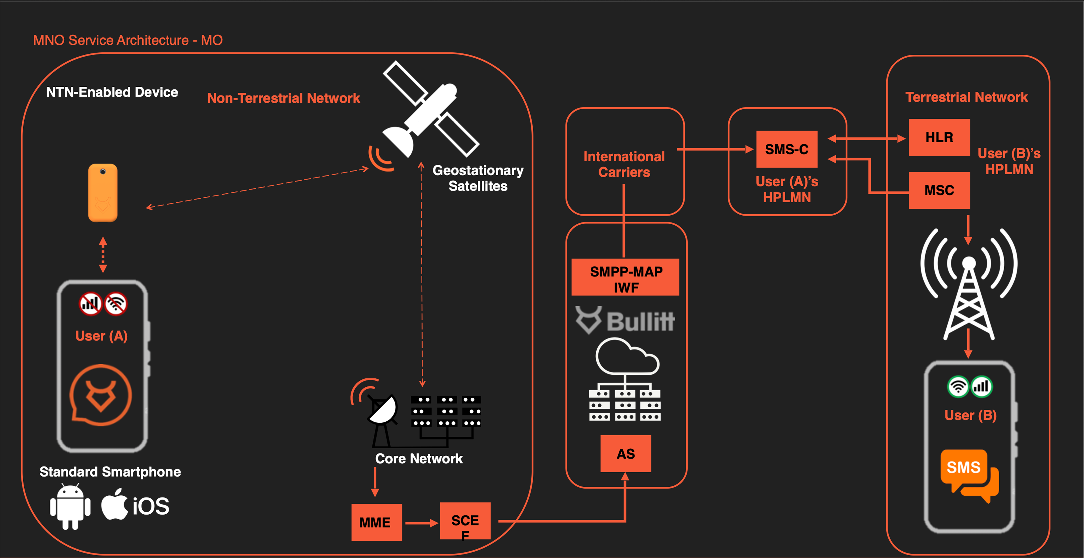 Bullitt connects satellite-enabled devices to the MNO’s mobile core via a secure SS7 interconnect, allowing NTN messages to be delivered as carrier native SMS.